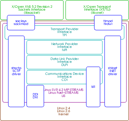 X/Open Transport Interface (XTI) This section provides a road map to Manual Pages for X/Open Transport Interface (XTI). This section provides a road map to Manual Pages for Linux Socket System (SOCKSYS). This section provides a road map to Manual Pages for Sockets. Transport Provider Interface (TPI) This section provides a road map to Manual Pages for Transport Provider Interface (TPI). Network Provider Interface (NPI) This section provides a road map to Manual Pages for Network Provider Interface (NPI). Data Link Provider Interface (DLPI) This section provides a road map to Manual Pages for Data Link Provider Interface (DLPI). Communications Device Interface (CDI) This section provides a road map to Manual Pages for Communications Device Interface (CDI). This section provides a road map to Manual Pages for Network Layer Interface (NLI). This section provides a road map to Manual Pages for Link Layer Interface (LLI). Wide Area Network Interface (WAN) This section provides a road map to Manual Pages for Wide Area Network Interface (WAN). | |||||||||||||||||||||